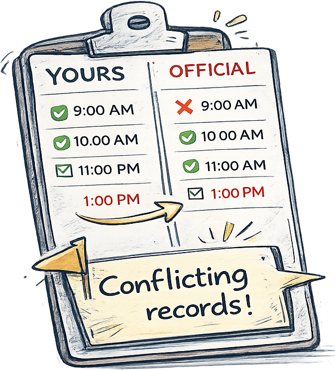 It compares your manual marks with official records and highlights every conflicting entry — so nothing slips through the cracks.